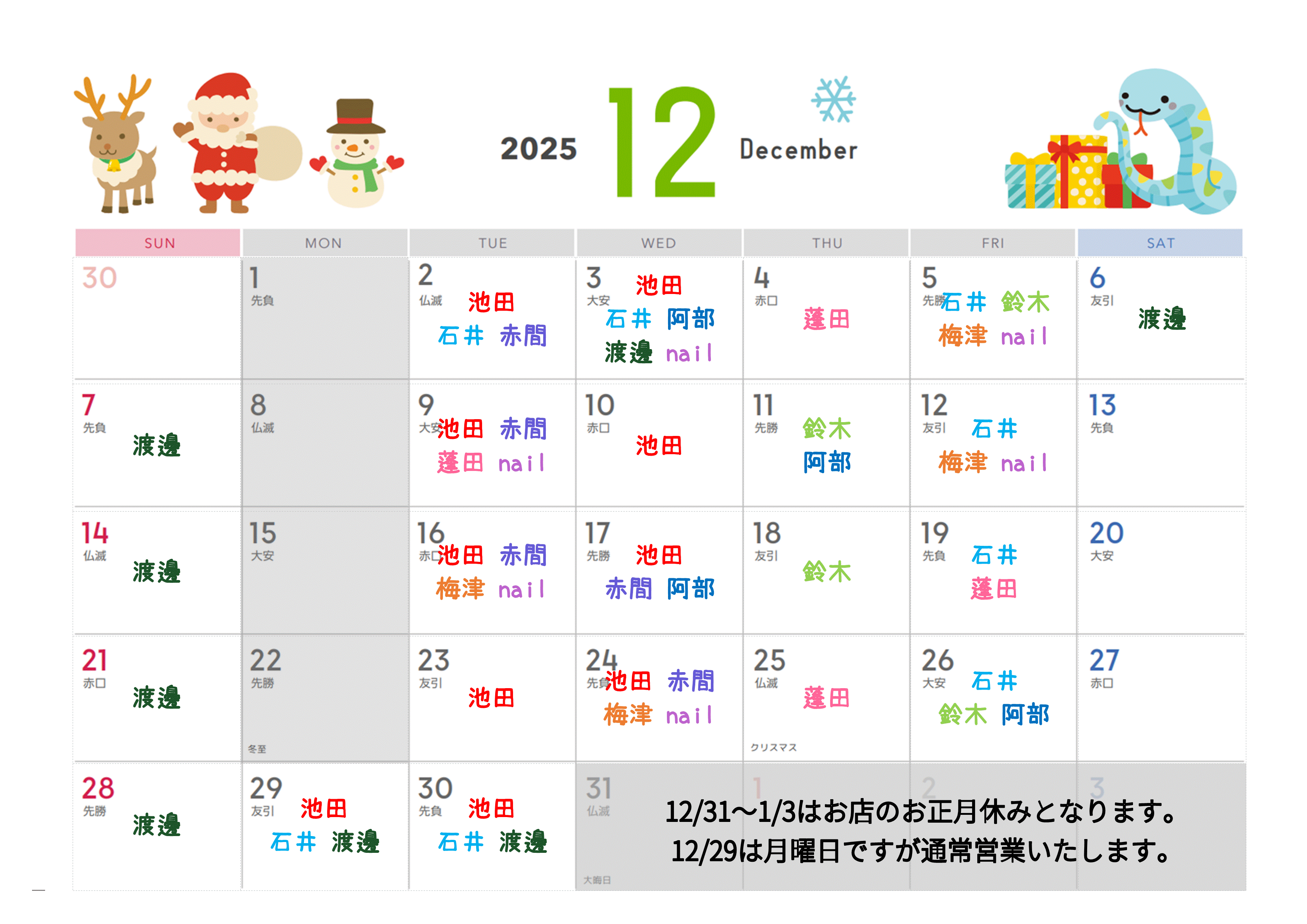 NEWS aria holiday 2024.06.07 ★池田★事務所勤務の為、火・水不在 ★渡邊★日祝定休、10:00~16:00最終受付カラーorパーマ~14:00/カット~15:00★12/31~1/3はお店のお正月休みとなります。